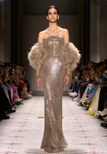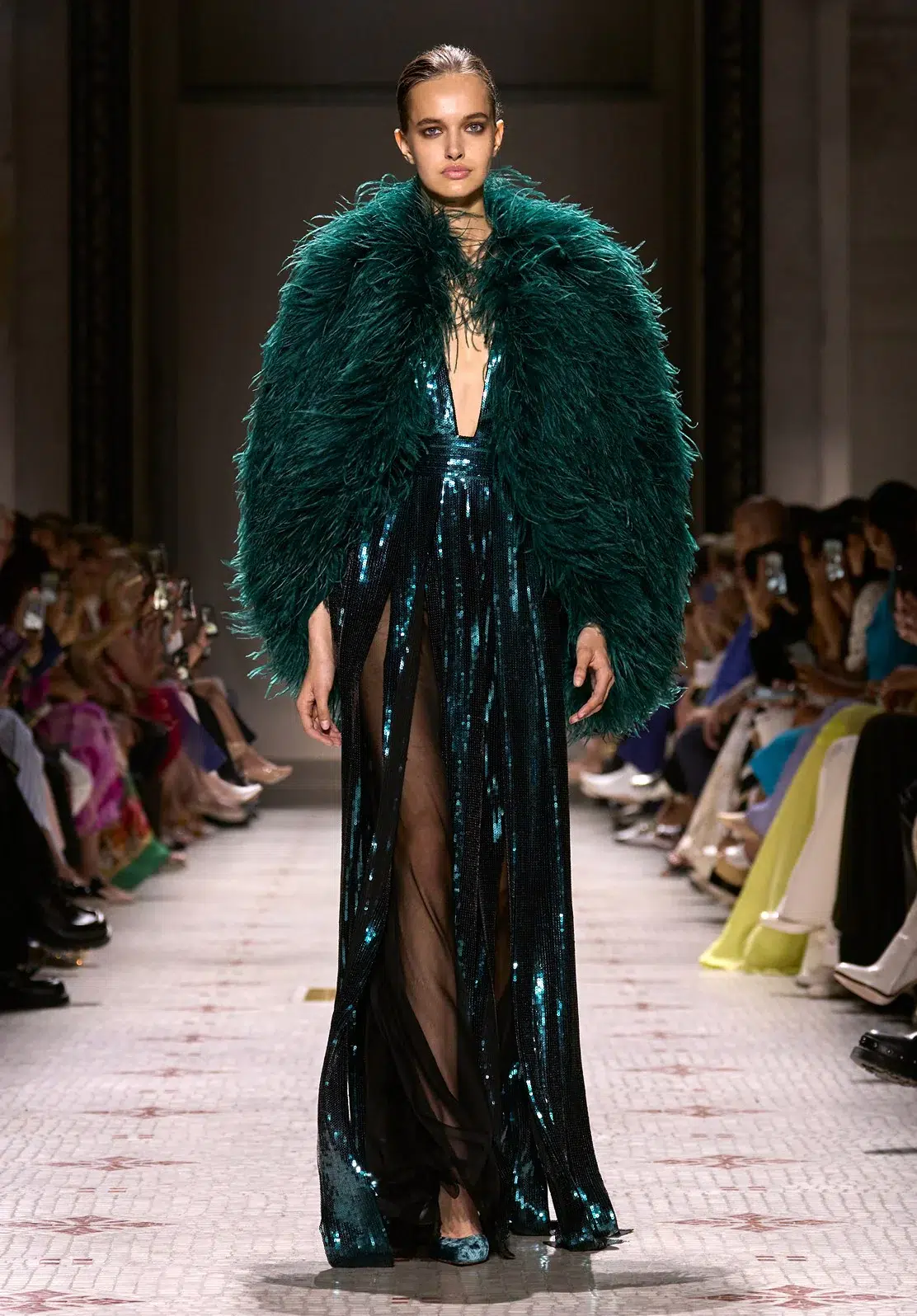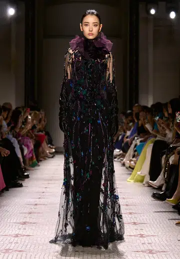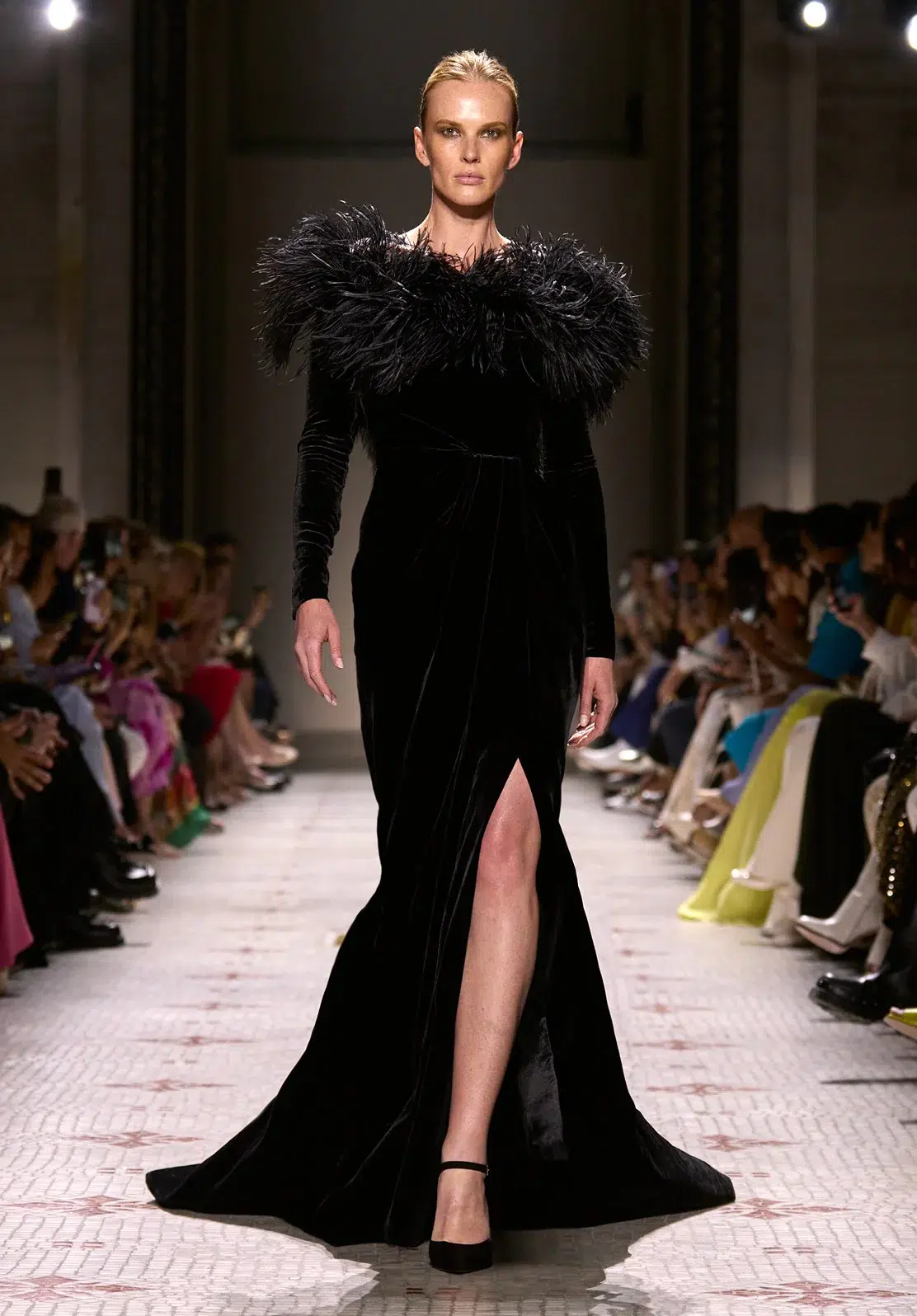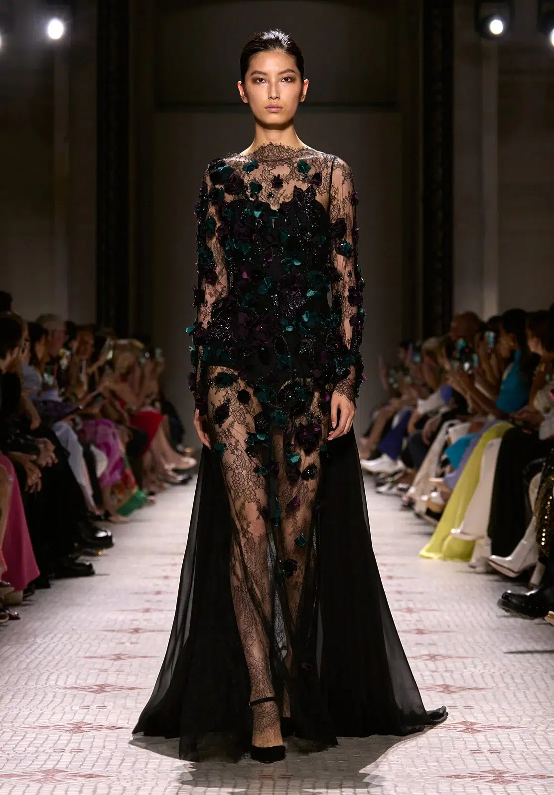 إيلي صعب في مجموعة خريف وشتاء 24- 25 يطلق العزف الرخيم. ينشد أغاني قوطية على مسرح الأناقة.