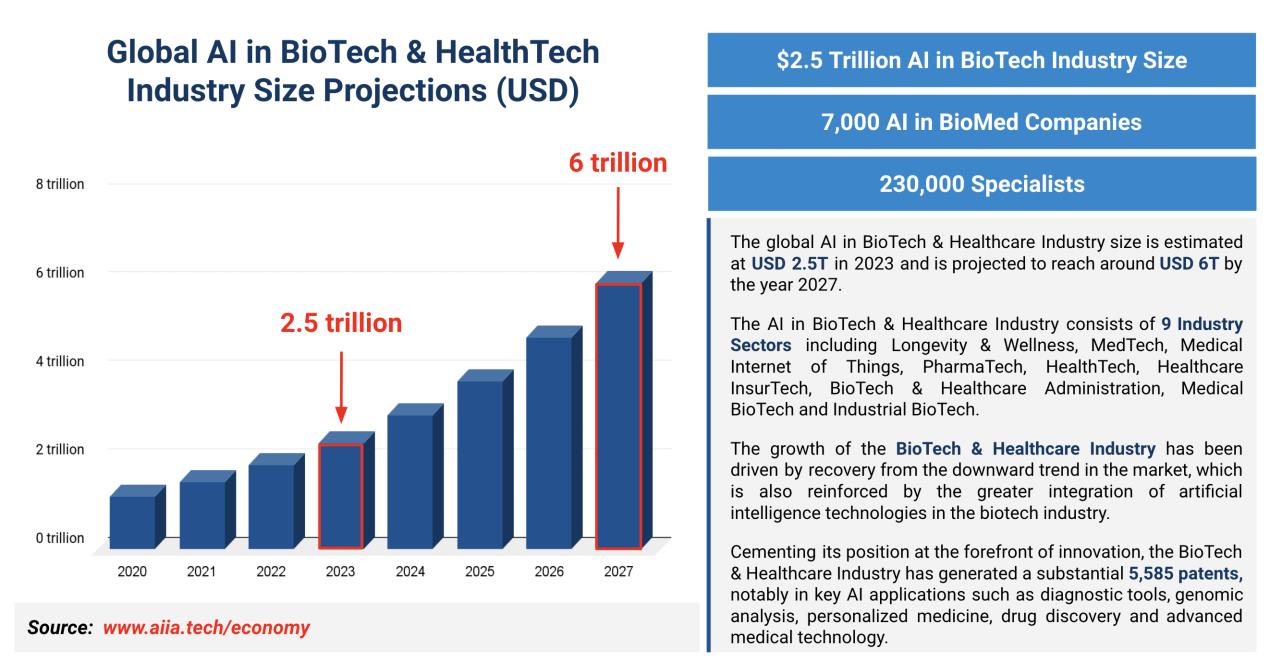 في حين اعتُبر الذكاء الاصطناعي قبل خمس سنوات قطاعًا صغيراً في مجال التكنولوجيا الحيوية، إلى أن حجم القطاع بلغ اليوم 2.5 تريليون دولار