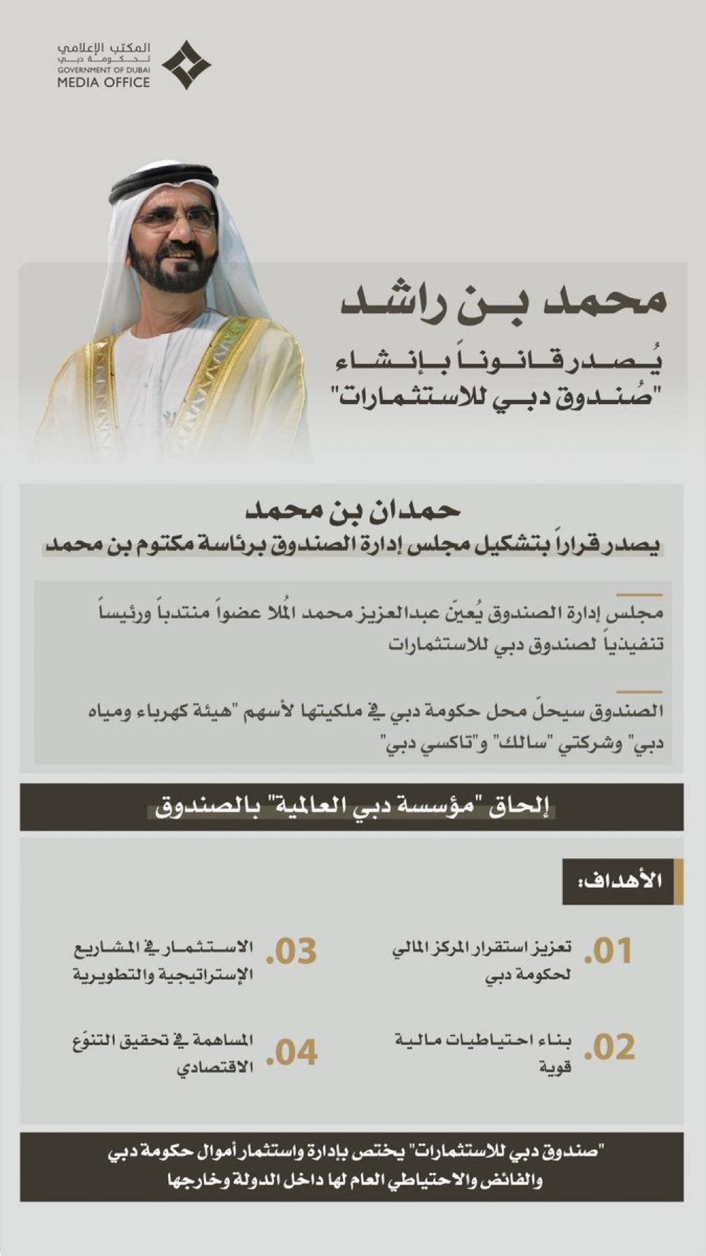 وسيحُل الصندوق محل حكومة دبي في ملكيتها لأسهم “هيئة كهرباء ومياه دبي” وشركتي “سالك” و”تاكسي دبي”. فيما سيتم إلحاق “مؤسسة دبي العالمية” بالصندوق .