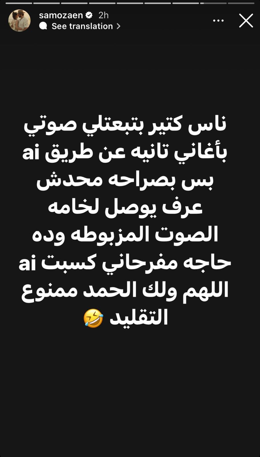 نشر سامو زين ستوري عبر موقع تبادل الصور والفديوهات القصيره انستغرام، وكتب الآتي: فيه ناس كتير بتبعتلي صوتي وأنا بغني أغاني تانيه عن طريق الذكاء الأصطناعي بس بصراحه محدش عرف يوصل لخامه الصوت المزبوطه وده حاجه مفرحاني