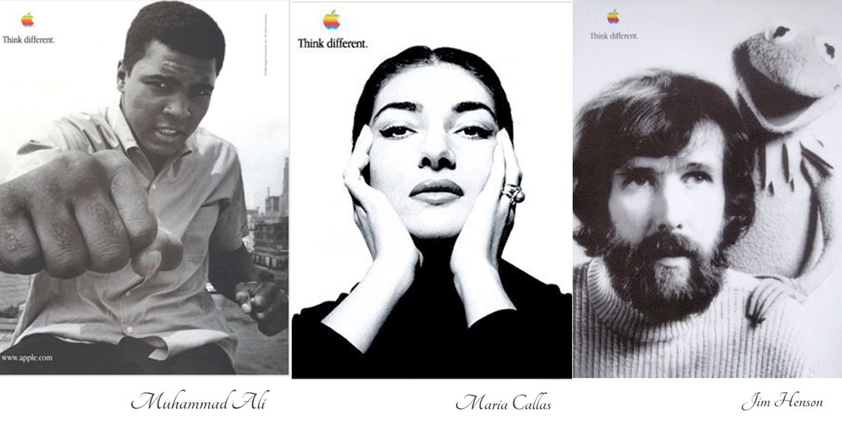 بدأت آبل في التسعينيات حملتها الإعلانية “فكّر بشكل مختلف” والتي استمرت من عام 1997 إلى عام 2002، حيث احتفلت بحياة وإنجازات مشاهير الفنانين والقادة وأصحاب الرؤى، وشجعت المشاهدين على “التفكير بشكل مختلف” واحتضان إبداعاتهم. يرسم ستيف جوبز صورة أكثر إشراقًا لمستقبل شركة أبل بعد وقت قصير من عودته مع تقديم حملة “فكر بشكل مختلف”. تم استخدام الشعار في الإعلانات التليفزيونية والعديد من الإعلانات المطبوعة والعديد من الإعلانات التلفزيونية لمنتجات Apple.