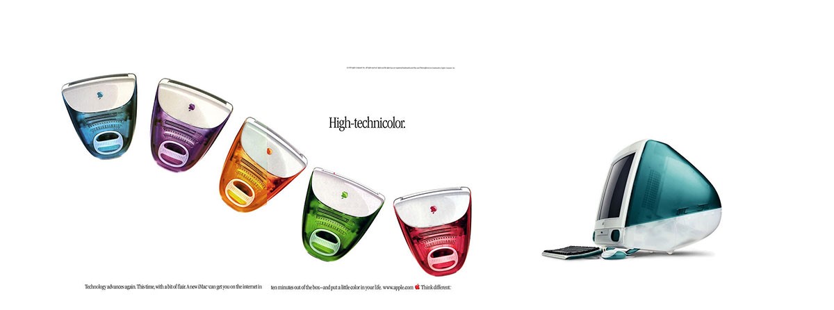 وفي التسعينيات أيضًا، أصدرت شركة Apple جهاز iMac. الآن حصلت أجهزة كمبيوتر Apple على خمسة ألوان جديدة: Blueberry، Grape، Mandarin، Lime، و Strawberry. مع إصدار جهاز iMac في التسعينيات، أصبحت إعلانات Apple أكثر فنية وملونة، مع التركيز بشكل أكبر على المنتج نفسه. وهكذا، في عام 2020، كانت عبارة “فكر بشكل مختلف” لا تزال مطبوعة على الجزء الخلفي من علبة جهاز iMac.