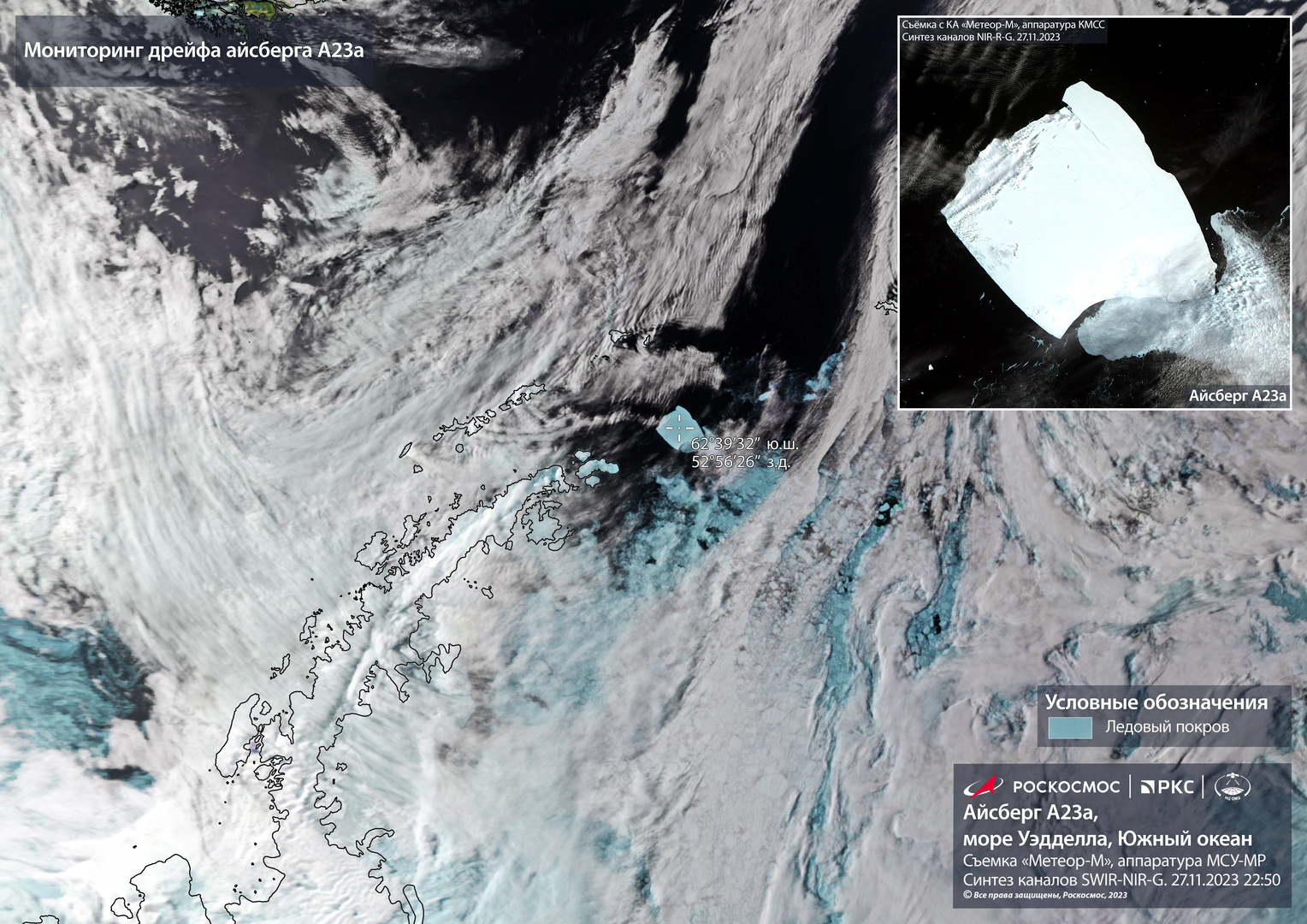 تم التقاط الصورة بواسطة القمر الصناعي الروسي للأرصاد الجوية والمائية Meteor-M،وتُظهر اللقطات الموجودة على موقع “روس كوسموس” مغادرة A23a بحر ويديل ودخوله إلى المياه المفتوحة للمحيط الجنوبي.