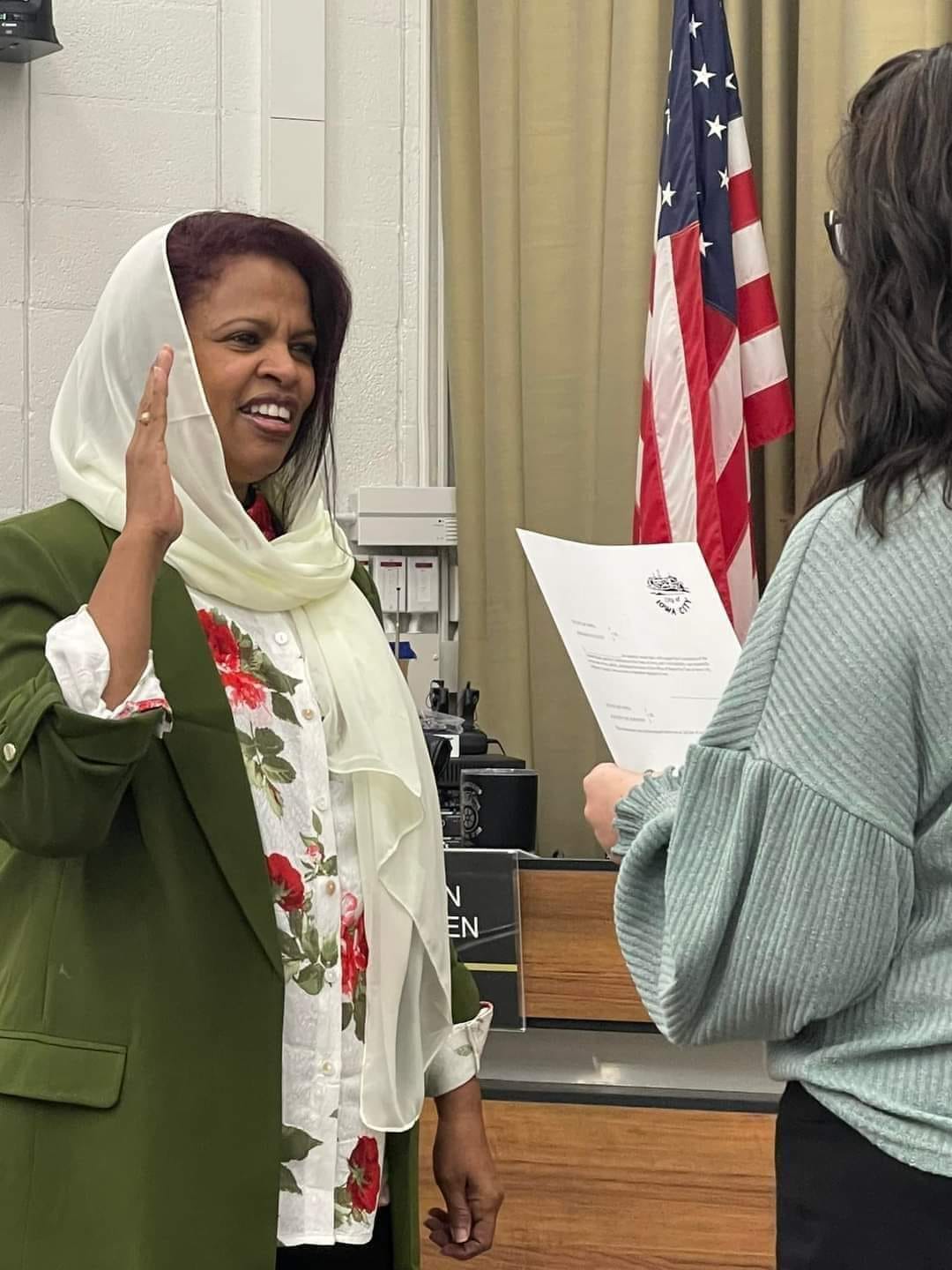 تسلمت السودانية بنت دنقال مزاهر صالح القسم كنائب عمدة لولاية أيوا الأميركية أمام قاضي المحكمة الفيدرالية مع بداية يناير 2024.