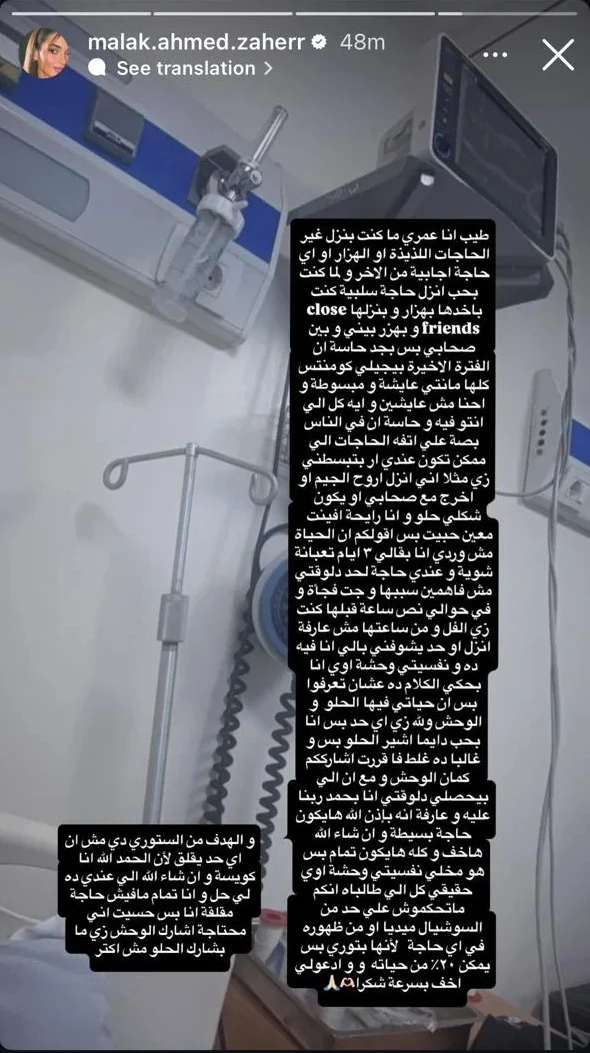 نشرت ملك على خاصية القصص المصورة الملحقة على حسابها الخاص بـ”إنستغرام” صورة لغرفة في أحد المستشفيات، وعلقت عليها بمنشور طويل، قالت فيه: “عمري ما بنزل غير الحاجات اللذيذة أو الهزار أو أي حاجة إيجابية، ولما كنت بنزل حاجة سلبية كانت بتبقى من وراها هدف، وغالبًا كنت باخدها بهزار بيني وبين صحابي”.