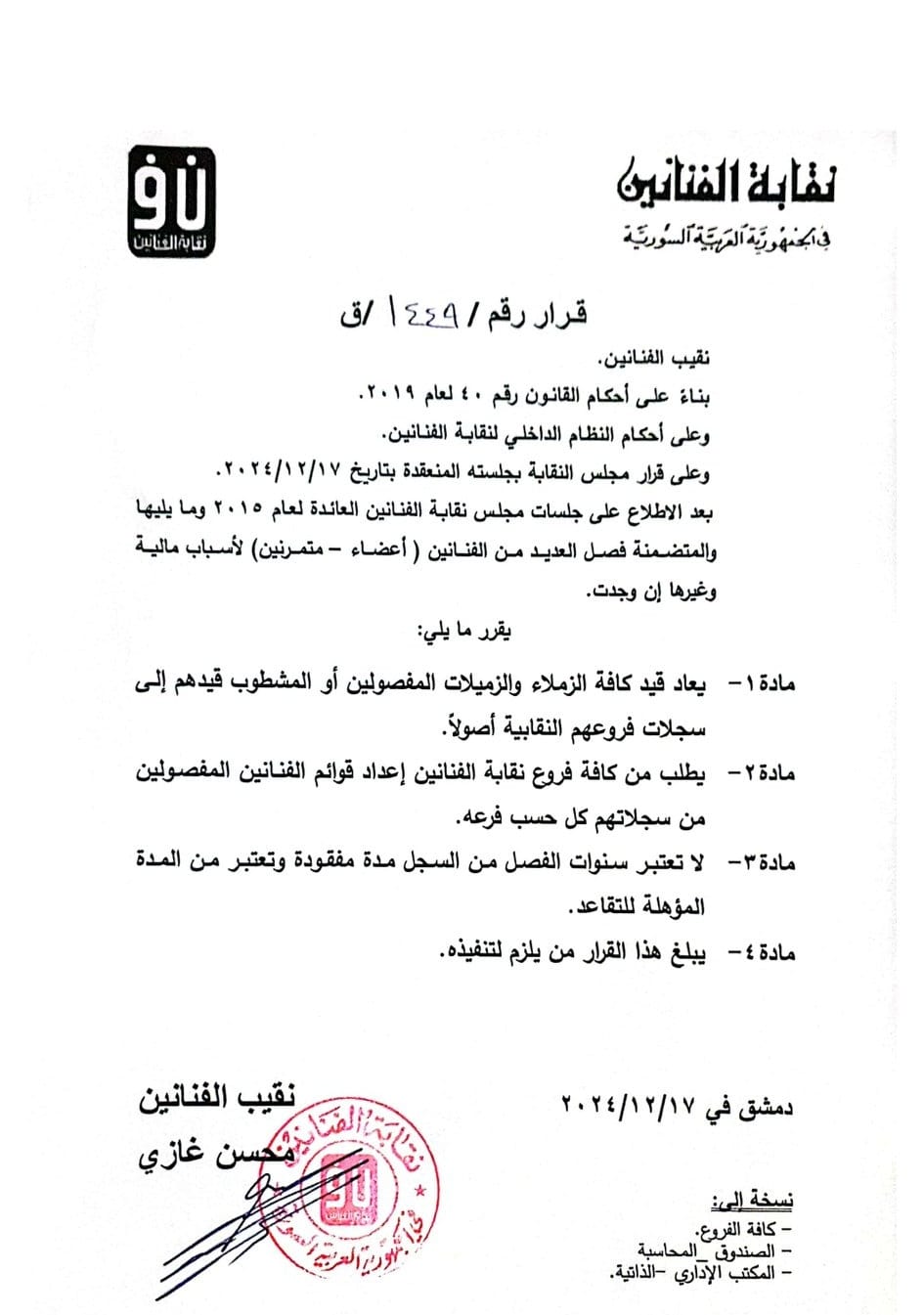 نشرت نقابة الفنانين في سوريا – فرع دمشق، في صفحتها عبر فيسبوك صورة لقرار يحمل توقيع النقيب محسن غازي، حول الفنانين المفصولين من النقابة “لأسبابٍ مالية وغيرها إن وجدت”.