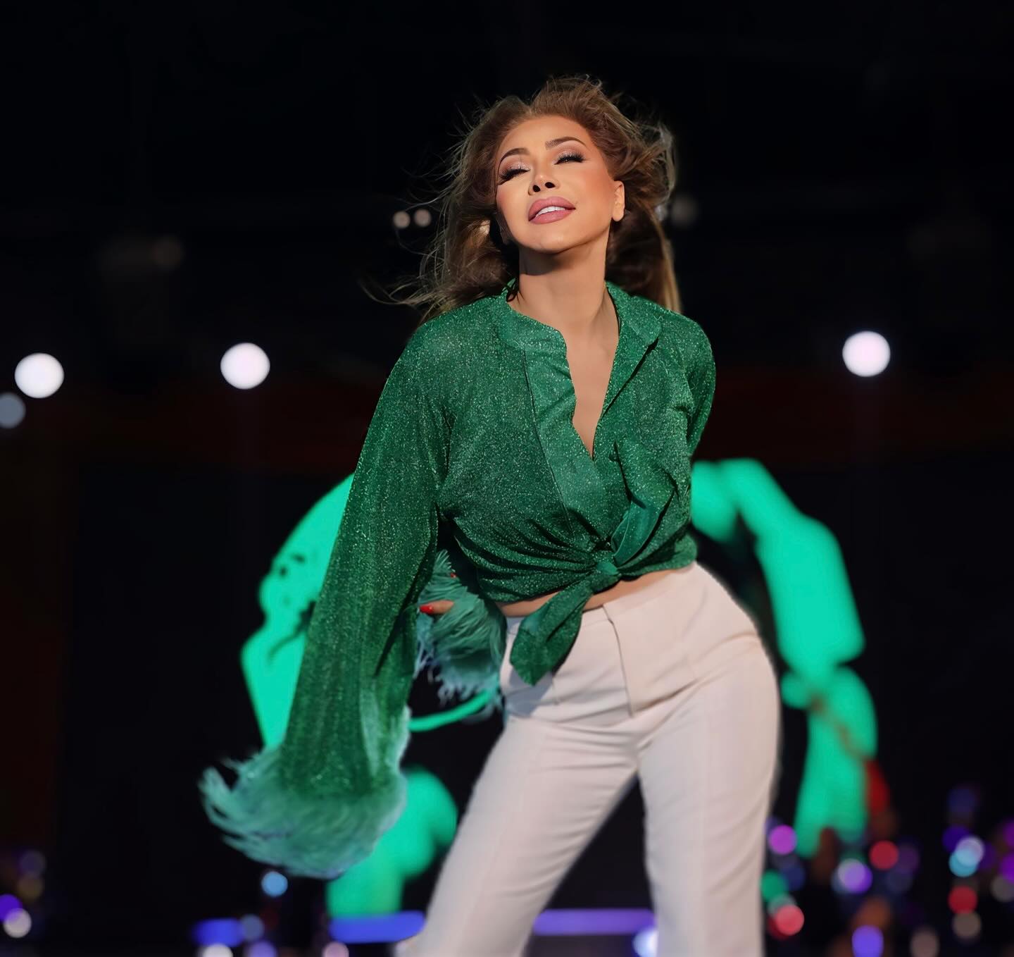 أرادت نوال أن يكون العمل كله شبابي لباسها فيه شيء من هذا القبيل. سوبر كاجوال انيق بين الأسود والاخضر والجينز تحيك نوال ثلاث إطلالات كلها ذات مذاق واحد في حلق الأناقة الشبابية العملية التي تعرف كيف تكونها وتسطرها لتكون أستاذة في مجال الاناقة والظهور. يكفي نوال أن تعقد القميص الأخضر البراق ذات الريش المتطاير على الخصر بربطة متفلته وتدمج طلتها بسروال ابيض فهذا يجعل من هذه الإطلالة سباقاً في عالم الموضة.