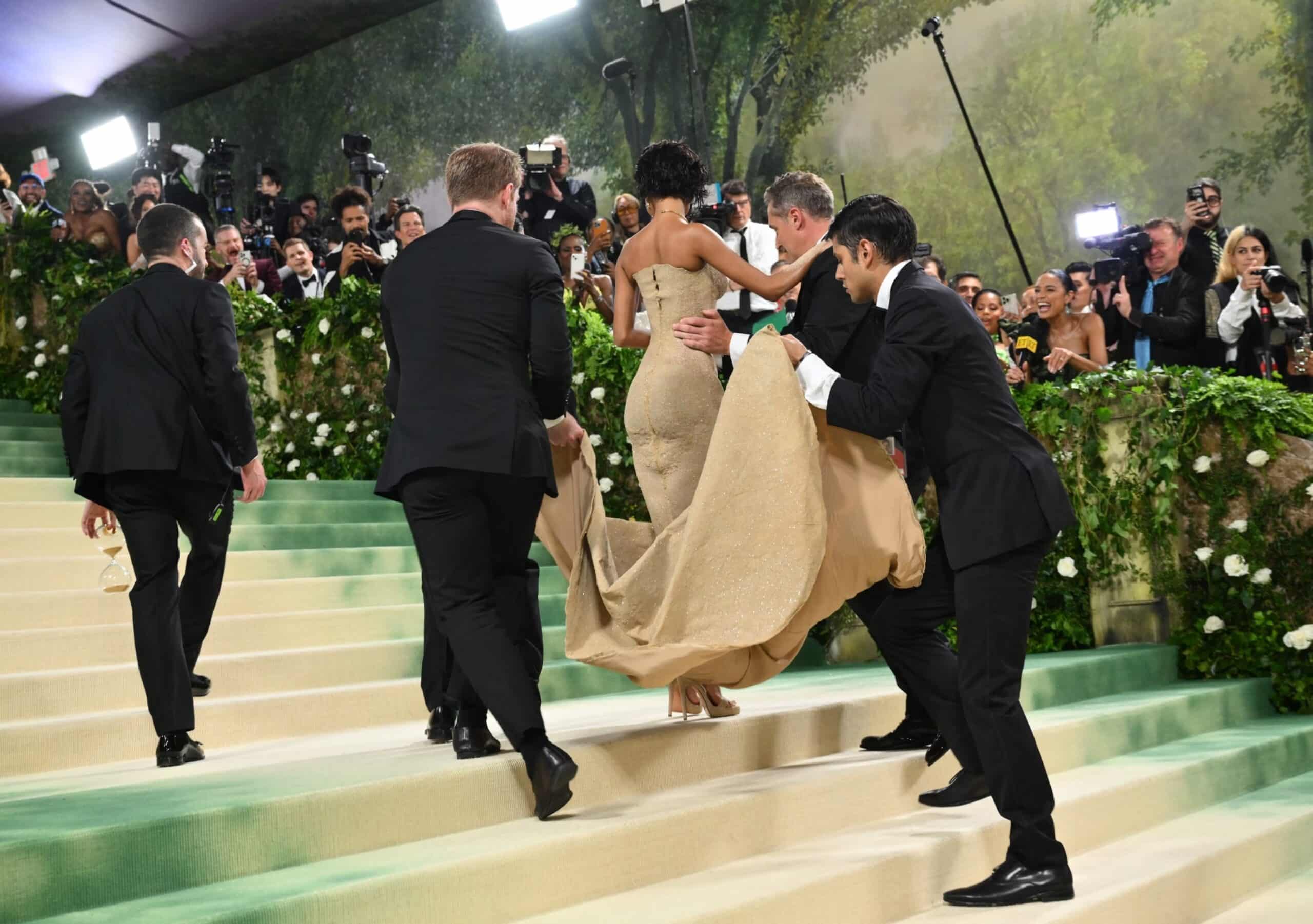 بالنسبة إلى المشاهير، أبرز لحظات “ميت غالا”، هي اللحظة التي يصعدون فيها الدرج الشهير إلى مدخل متحف “متروبوليتان”. أما نجمة البوب الجنوب أفريقية تيلا، والتي تشارك للمرة الأولى في حفل Met Gala هذا العام، فقد اتّخذت نهجاً فريداً في الصعود. بفضل فستانها الضيق الملتصق بجسدها من علامة Balmain، احتاجت تيلا إلى يد المساعدة، حيث نُشر مقطع فيديو على موقع X يُظهر أنه كان عليها أن تُحمل بين الدرجة والأخرى.