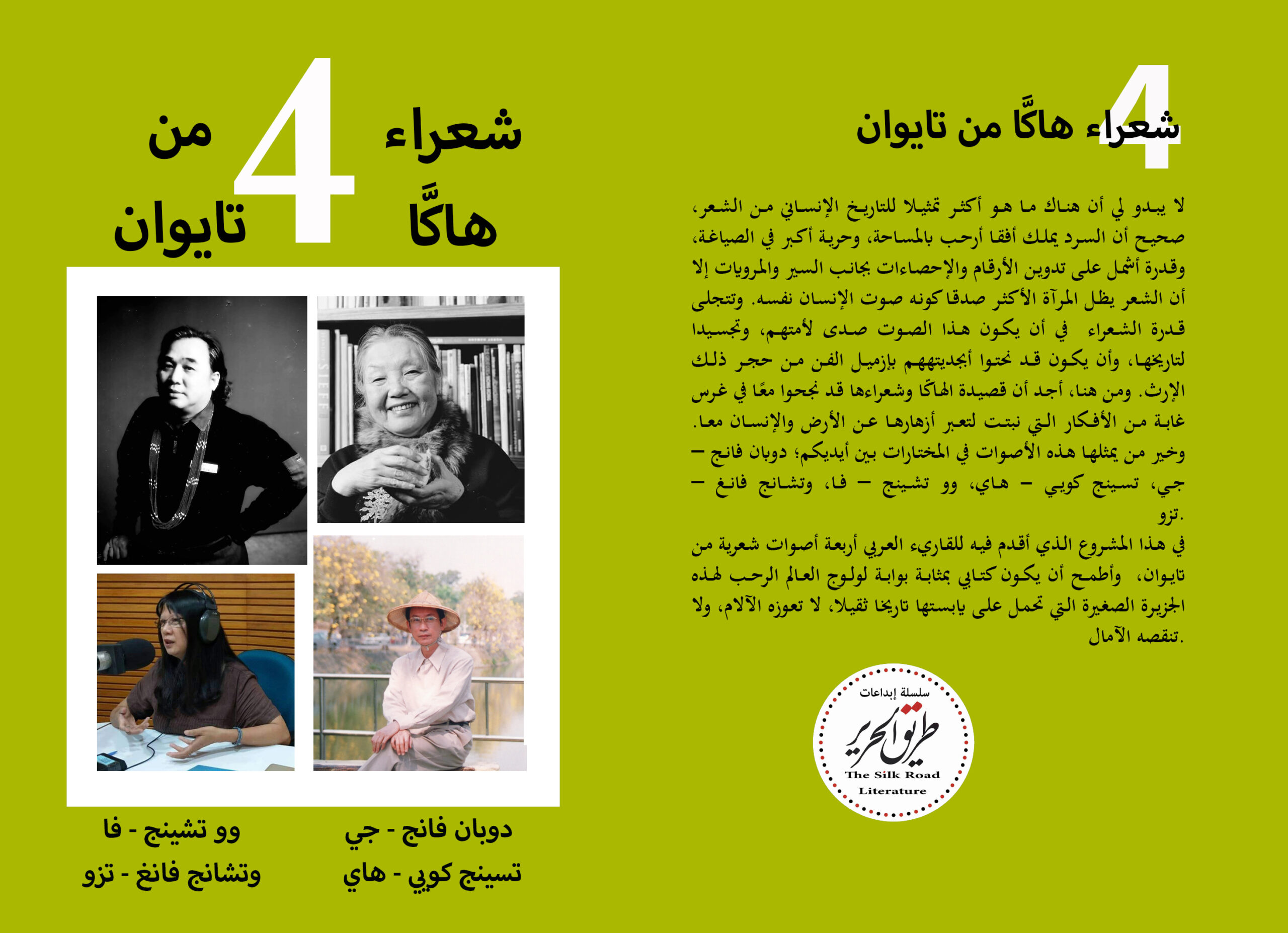 صدر كتاب جديد  ضمن سلسلة إصدارات الشاعر والمترجم والفنان المصري أشرف أبواليزيد، رئيس الجمعية الصحافيية الآسيوية AJA، حيث يكتب هذه المرة عن شعراء الهاكا في تايوان متناولاً أربعة منهم، هم: دوبان فانج – جي، تسينج كويي – هاي، وو تشين – فا، وتشانج فانغ – تزو.