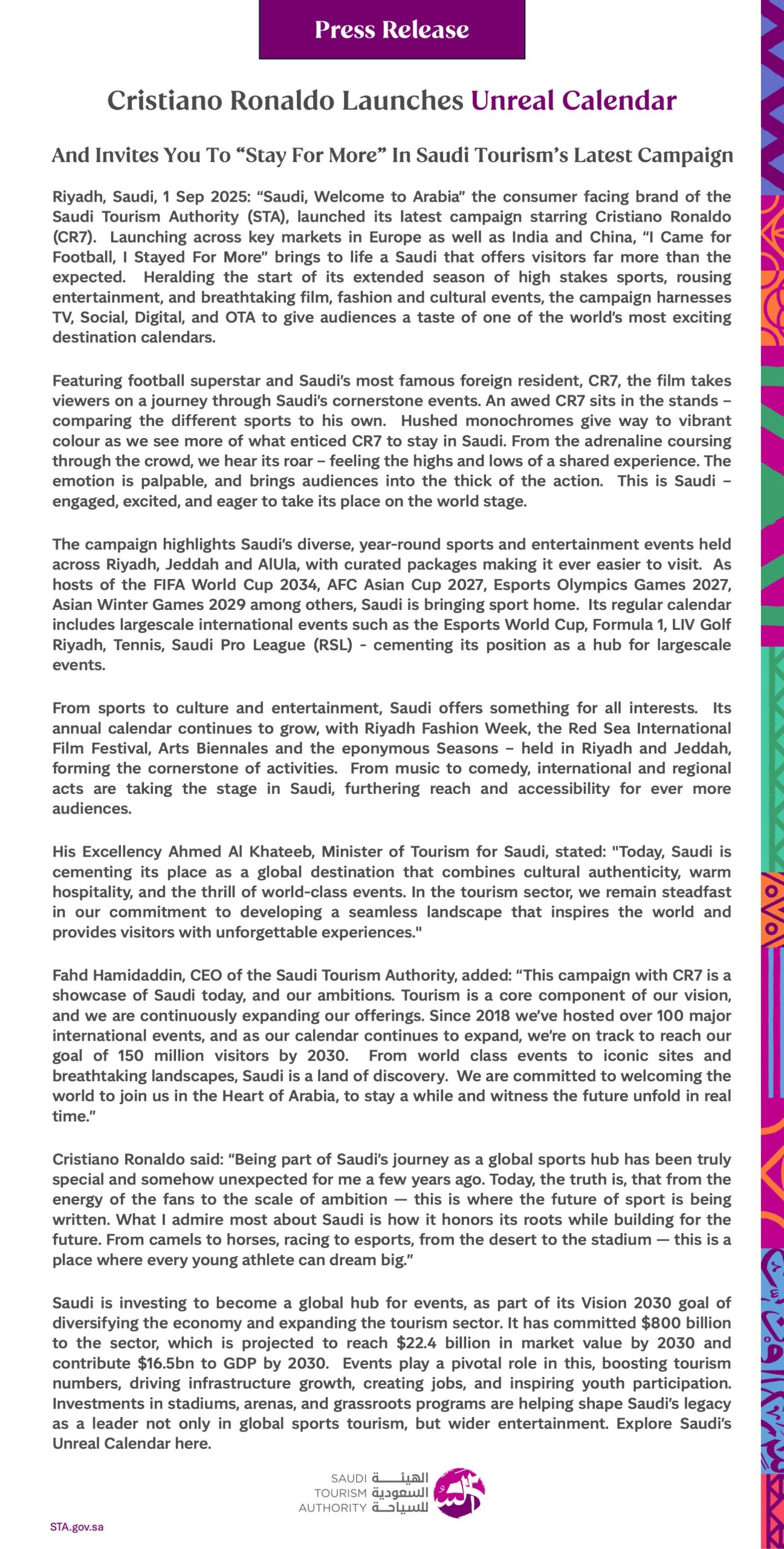 أطلقت الهيئة السعودية للسياحة جدول فعاليات السعودية الاستثنائي، ضمن حملتها العالمية الجديدة بمشاركة نجم النصر البرتغالي كريستيانو رونالدو، تحت شعار: “أتيت من أجل كرة القدم، وبقيت لاستمتع بالمزيد“. وتهدف الحملة إلى إبراز تنوع وغنى الفعاليات العالمية التي تحتضنها المملكة على مدار العام.