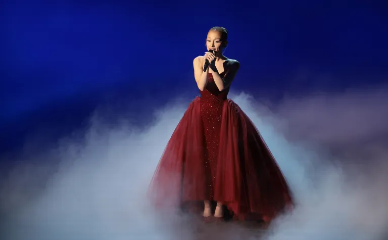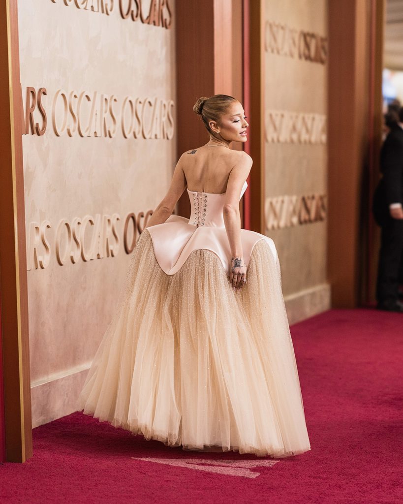 تخطت أريانا غراندي لونها الوردي العادي من تصميم دانييل روزبيري لدار Schiaparelli، تميز بتنورته المتموجة وجزئه العلوي المصمم بأسلوب الكورسيه. لصالح ثوب أحمر قرمزي في حفل توزيع جوائز الأوسكار 2025.