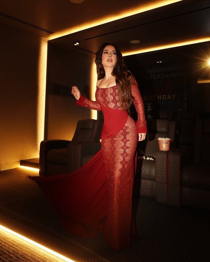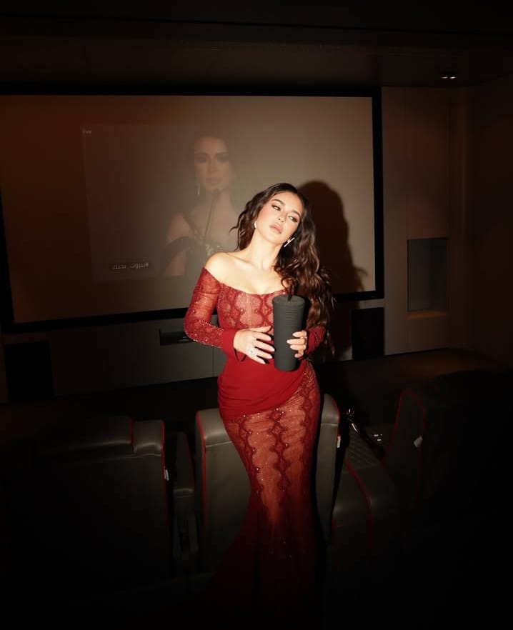 اما الإطلالة الأخرى الملفتة كانت لماغي بوغصن بفستان أحمر من تصميم رامي القاضي مكمم ومفتوح الصدر مع الكتفين مخرج بالدانتيل الرقيق الذي يظهر منحنيات الجسم مع قماش على الوسط يأتي كبطانة لتلك الفراغات المثيرة التي يتركها الدانتيل في فراغاته الكاشفة. تسريحة شعر ماغي بوغصن متماوجة ومفرودة من ميشال ليون وتزينت بمجوهرات وخاتم كبير من هيمو أما خطوط الوجه فجاءت بريشة داني كامل مكياج ينحت الوجه بالوان دافئة وعيون ساحرة بالكحل القوي المحدد. واحمر شفاه بلون الشفاه الوردية الفاتحة. ماغي التي نالن جائزة افضل ممثلة لبنانية لعام 24 عن مسلسل “ع أمل”.