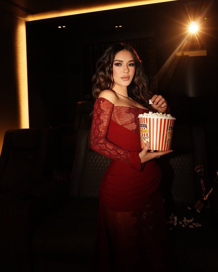 اما الإطلالة الأخرى الملفتة كانت لماغي بوغصن بفستان أحمر من تصميم رامي القاضي مكمم ومفتوح الصدر مع الكتفين مخرج بالدانتيل الرقيق الذي يظهر منحنيات الجسم مع قماش على الوسط يأتي كبطانة لتلك الفراغات المثيرة التي يتركها الدانتيل في فراغاته الكاشفة. تسريحة شعر ماغي بوغصن متماوجة ومفرودة من ميشال ليون وتزينت بمجوهرات وخاتم كبير من هيمو أما خطوط الوجه فجاءت بريشة داني كامل مكياج ينحت الوجه بالوان دافئة وعيون ساحرة بالكحل القوي المحدد. واحمر شفاه بلون الشفاه الوردية الفاتحة. ماغي التي نالن جائزة افضل ممثلة لبنانية لعام 24 عن مسلسل “ع أمل”.