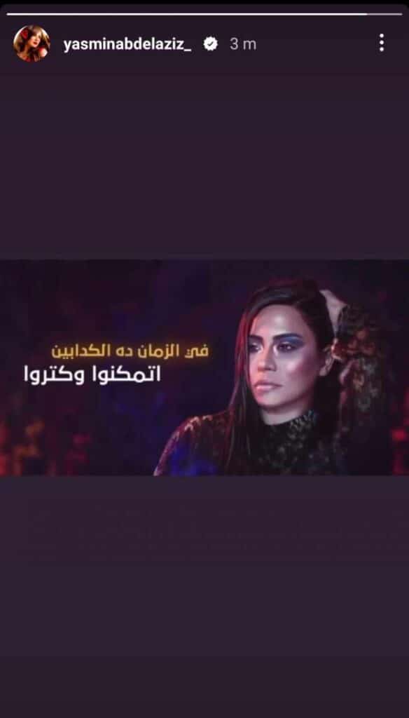 وانتظر الجمهور التعليق الأول للنجمة المصرية على التصريحات الرومانسية لزوجها السابق والتي تضمنت تأكيداً بأنها كانت وستظل حبه الحقيقي والوحيد، ولكن المفاجأة أن ياسمين أعادت نشر أغنية “كدابين” للمطربة شيرين عبد الوهاب التي تردد أنها صنعت خصيصاً للنيل من حسام حبيب عقب طلاقهما الأول، وتوقّع متابعوها أن كلمات الأغنية تمثّل ردّ ياسمين على كلمات العوضي الرومانسية، والتي تقول: “كل ما أنسى لك كلامك.. بارجع أفتكره.. في الزمان ده الكدابين اتمكنوا وكتروا”.
