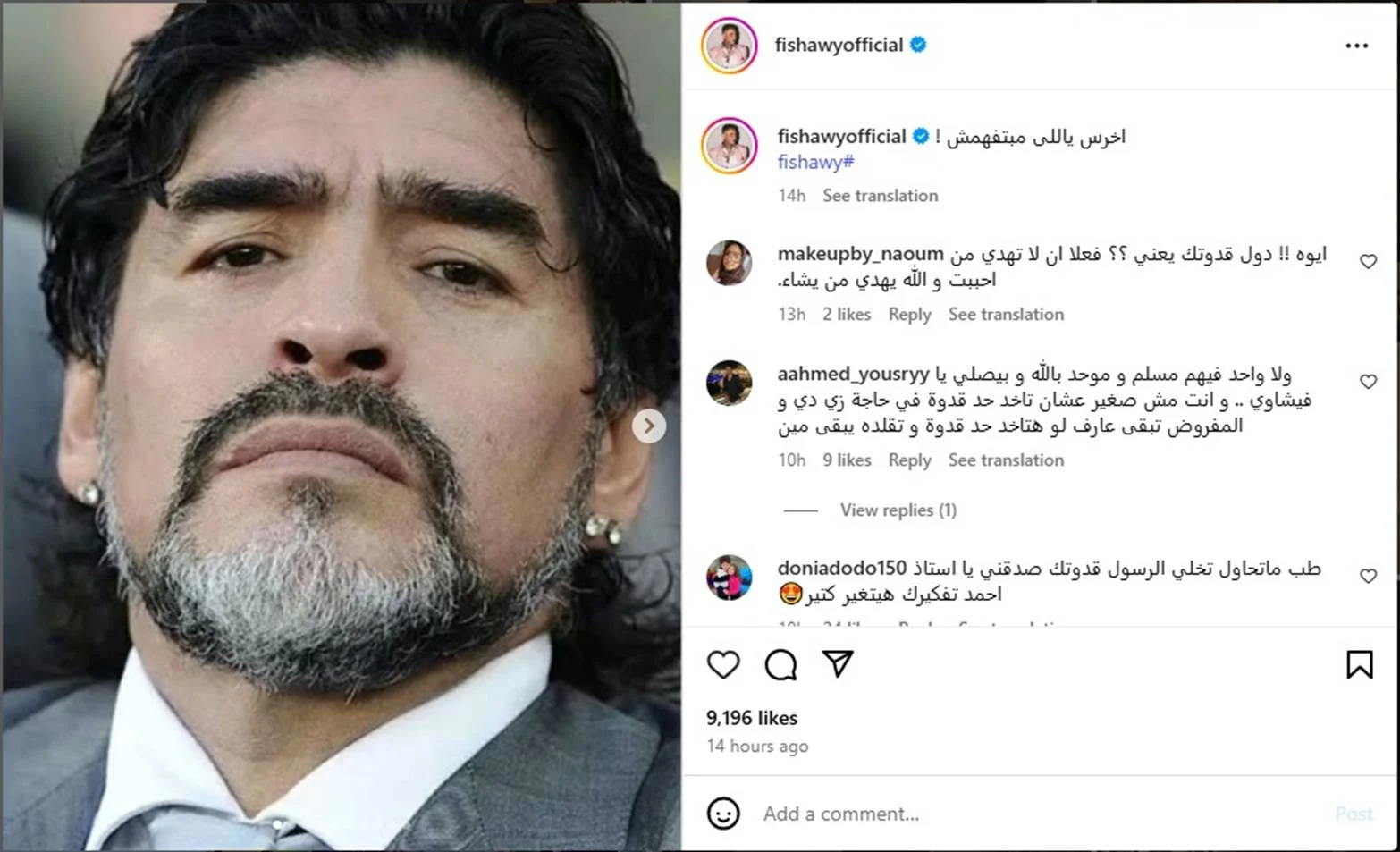 نشر الفيشاوي عبر حسابه الرسمي مجموعة صور لعدد من النجوم العالميين الذين يظهرون وهم يرتدون الحلق، مثل الأسطورة الأرجنتيني مارادونا والممثل الأميركي مورجان فريمان، ولاعب الكرة البرتغالي كريستيانو رونالدو، وغيرهم، وعلق برسالة مقتضبة لكنها حادة حيث قال: “اخرس يا اللي مبتفهمش”، في رسالة مباشرة إلى من يهاجمون خياراته الشخصية.