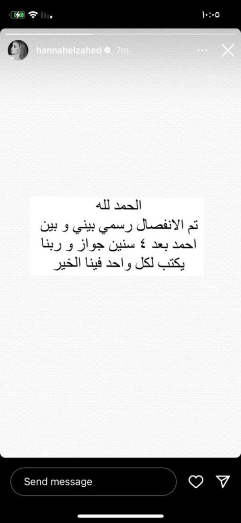 ونشرت هنا الزهد عبر حسابها الشخصي على موقع انستغرام، استوري، وكتبت عليه: الحمد لله، تم الانفصال رسمي بيني وبين أحمد بعد جواز 4 سنوات وربنا يكتب اللي فيه الخير.
