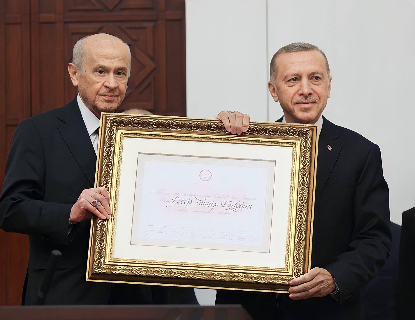وقبل ادلاء اليمين، تسلم رجب طيب أردوغان “شهادة الرئاسة” من الرئيس المؤقت لمجلس الأمة التركي “دولت باهتشلي” كإعلان رسمي لتنصيبه رئيساً للجمهورية التركية لولاية ثالثة.