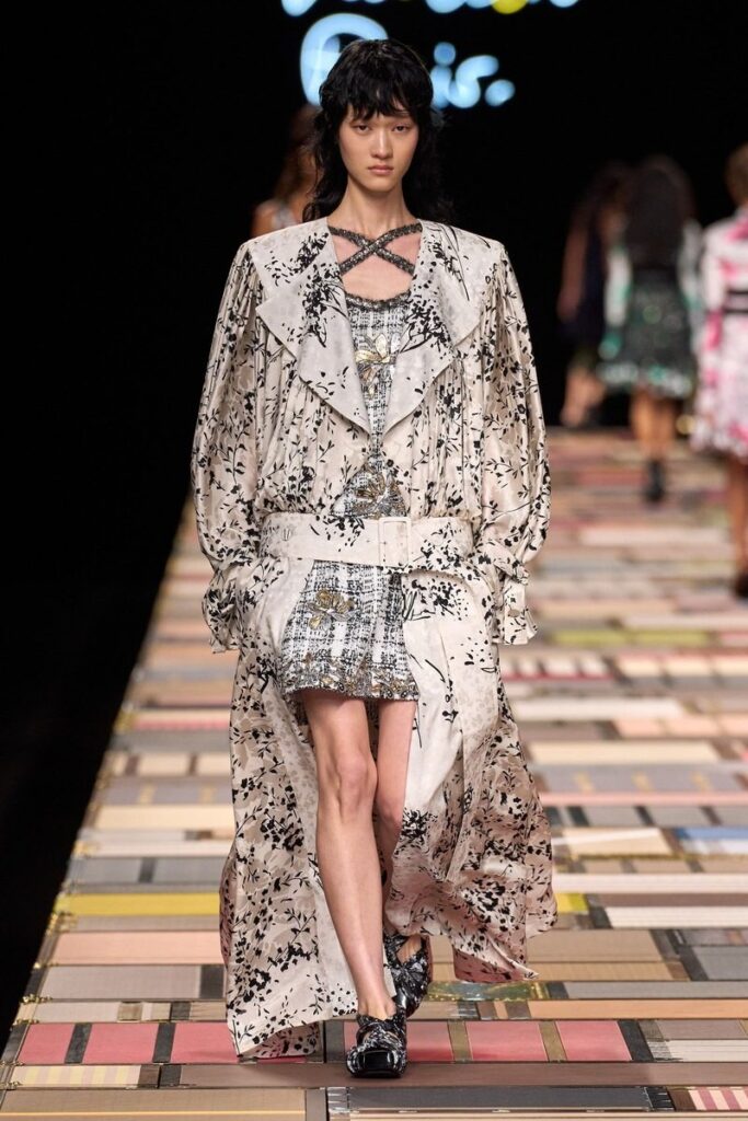 بدأت المجموعة بسلسلة من السترات التي تثير هذا التباين على الفور. مع الأكمام المنفوخة الضخمة والخصر المشدود والحواف البيبلوم ، كانت الملابس المهيكلة مرنة بشكل مخادع ، ولم يتم تعزيز هذا الشعور بالتهوية إلا من خلال البلوزات المفتوحة ذات الأزرار لأسفل مع تفاصيل مربوطة بشكل فضفاض وقلائد طويلة معقدة تم وضعها فوق طبقات. على الرغم من أن القصات ذات النمط المزدوج تبدو وكأنها تعود إلى عصر النهضة ، إلا أن مطبوعاتهم النابضة بالحياة وتصميمهم جنبا إلى جنب مع الملابس الداخلية وشورت الدراجة بطول الركبة يذكرون بأناقة وسيطرة عصر الثمانينات.