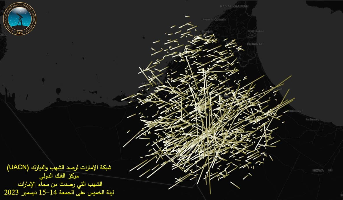 وتتكون “شبكة الإمارات لرصد الشهب والنيازك” من ثلاث محطات منتشرة في أماكن مختلفة في صحراء أبوظبي، تحتوي كل محطة على 17 كاميرا فيديو حساسة للضوء الخافت. وقد صورت الشبكة ليلة الأربعاء على الخميس 13-14 ديسمبر أكثر من 1800 شهاب، أما في ليلة الذروة ليلة الخميس على الجمعة 14-15 ديسمبر، صورت الشبكة أكثر من 1600 شهاب، وذلك على الرغم من أن السماء كانت غائمة لساعات.