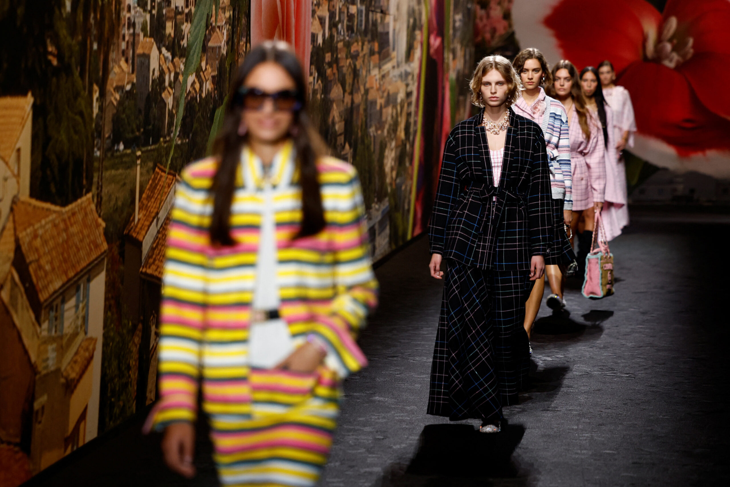 وسارت العارضات وسط قاعة العرض مترامية الأطراف بوسط باريس، واستعرضن مجموعات من التنانير والسترات الصوفية والفساتين الخفيفة التي تتدلى في الخلف.