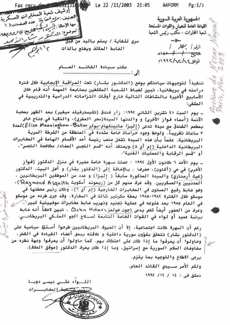 وكانت السيدة في ذلك الوقت رئيسة “قسم “المراقبة والعمليات التقنية” في الاستخبارات الداخلية، قبل أن تُعين لاحقاً رئيسة لقسم “مكافحة الإيرلندي”. والتقرير لا يورد وظيفتيها بدقة. ويشير إلى أنها شاركت في لقاء أوسع مع “العريسين” في غضون أسبوعين. ففي 6/12/1992 دُعيت إلى عشاء في بيت الدكتور فواز الأخرس والد أسماء، حضرته مجموعة من الشخصيات.