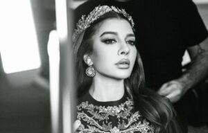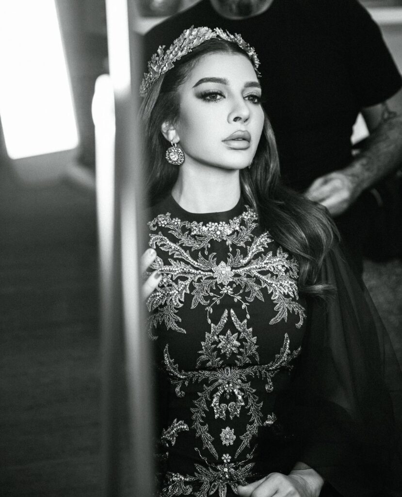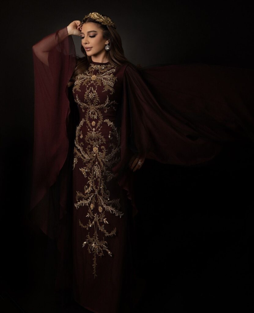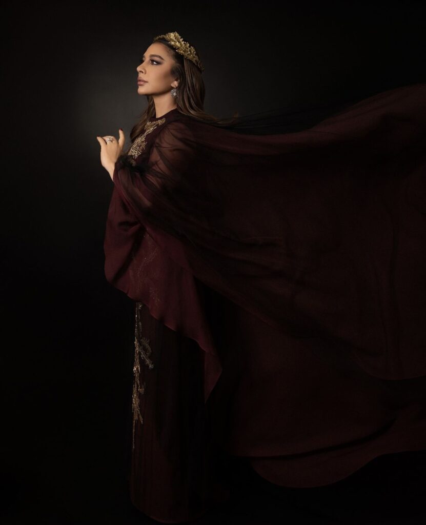 إطلالة أصالة لم تكن عادية بأناقتها المفرطة المنتقاة بذوق رفيع ذات معاني عالية. فيها روح القدم وفيها سطوع الحاضر ورفاهية الخياطة المتقنة بالشغل اليدوي على القماش المُنسدل. اللون الدافئ التاج على الرأس كما أباطرة الرومان. تصميم وضع فيه جابوتيان كامل إلهامه الراقي ليكون قطعة لا تمر عليها الزمن وتبقى طازجة أبداً.