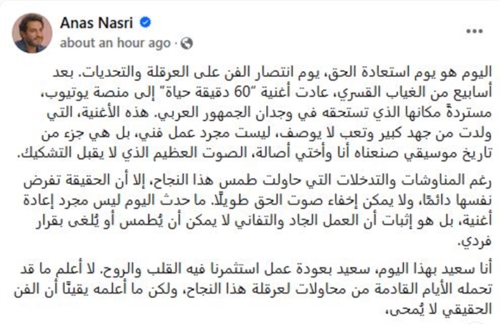 كتب أنس نصري عبر حسابه بموقع Facebook: “اليوم هو يوم استعادة الحق، يوم انتصار الفن على العرقلة والتحديات. بعد أسابيع من الغياب القسري، عادت أغنية “60 دقيقة حياة” إلى منصة يوتيوب، مستردةً مكانها الذي تستحقه في وجدان الجمهور العربي. هذه الأغنية، التي ولدت من جهد كبير وتعب لا يوصف، ليست مجرد عمل فني، بل هي جزء من تاريخ موسيقي صنعناه أنا وأختي أصالة، الصوت العظيم الذي لا يقبل التشكيك”.