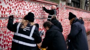 ويحمل الجدار الذي يبلغ طوله 500 مترًا ويقع على ضفاف نهر التايمز أكثر من 240 ألف قلب رسمت يدويا يمثل كل منها شخصا توفي بسبب كوفيد في المملكة المتحدة. وكُتِبَت آلاف العبارات، منها مثلا “جدتي، سأحبك إلى الأبد” و”فيل، دائما في قلبي”، “نحن نفتقدك كل يوم”.