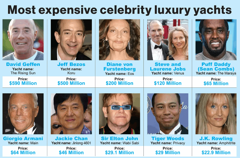 يحتل يخت “The Rising Sun” لقطب الإعلام ديفيد غيفن المركز الأول في القائمة، حيث تبلغ قيمته 590 مليون دولار.
