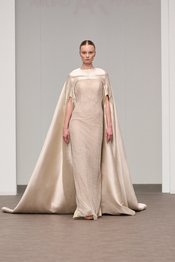 استهل العرض بفستان أسود Mermaid ديكولتيه، يمتد طوله إلى الأرض، مصمم بقبة عالية ومنسق مع قفازات طويلة شفافة مزدانة بالتطريز الأسود، وغطاء وجه شفاف أسود مطرز من الأمام. ومن ثم فتح باقة اللون نحو الذهبي والفضي والأحمر.