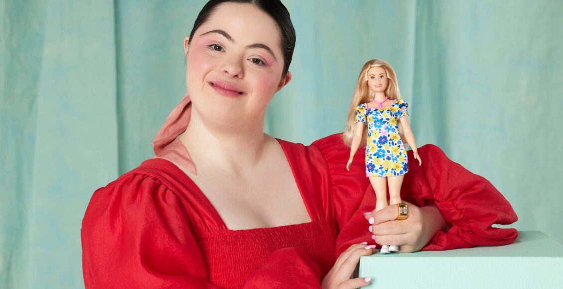 حدث في السوق منذ يوم الثلاثاء أول باربي مصابة بمتلازمة داون بسعر14.99 يورو بعيون لوزية الشكل وهي أصغر حجماً وترتدي فستانًا مطبوعًا بالرموز النموذجية من مجتمع متلازمة داون كالفراشات والزهور الصفراء الزرقاء.