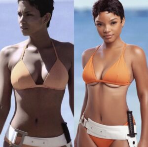 هالي بيلي ارتدت ملابس سباحة بلون برتقالي فاتح مستوحاة من إطلالة هالي بيري، التي جسّدت دور إحدى فتيات جيمس بوند في فيلم Die Another Day عام 2002.