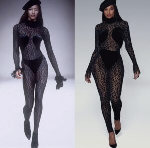 سيارا أعادت إحياء إحدى إطلالات نعومي كامبل على منصّة عرض الأزياء في زمن شبابها، بارتدائها “كات سوت” أسود شفّاف مطبّع بنمط جلد الفهد، وبتفصيل مخملي أسود يغطّي الصدر، ويشكّل سروال “مايوه” من النسيج واللون نفسه، كما انتعلت كندرة مدبّبة سوداء، واعتمرت قبعة “بيريه” من اللون نفسه.