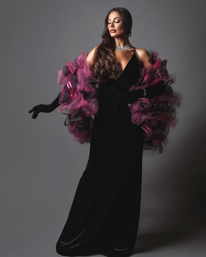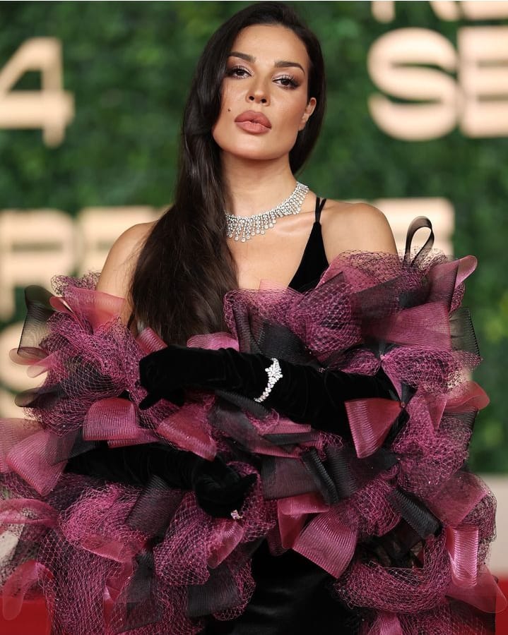 ثوب خاطف الأنفاس من جورجيو أرماني واختيار بلال فقيه. إطلالة نجيم فيها الكثير من الإغراء بين اللون الأسود المكلل بفوج حريري ناعم والصدر المكشوف والشعر الطويل المسحوب على جهة واحدة ليظهر العنق الماسي. أما القفازات السوداء ففيها شيء من التستر الرصين مسكور بسوار ماسي أخر يحكي عن بريق فوق لون قاتم. إطلالة فيها انقباض وانفراج بين الوان جدية وقصة تحكي اسرار الانوثة بالكثير من التكلف والإغراء.