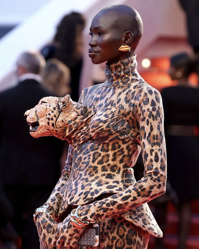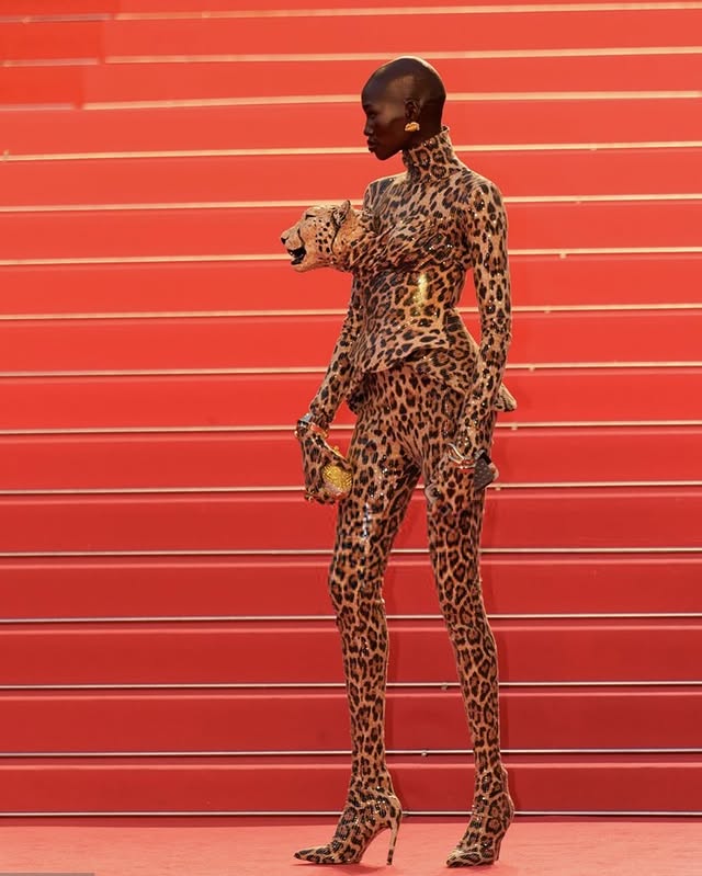 أحدثت عارضة الأزياء السودانيّة الأصول ميتشل أكات ماروكو ران ضجّة كبيرة في مهرجان كان 2025 حين أطلت الأسبوع الماضي على السجّادة الحمراء في العرض الأول لفيلم (The Sound of Falling) للمخرجة الألمانية “ماشا شيلينسكي” (Mascha Schilinski)، بتصميم مذهل حمل توقيع المصمّم المبدع “هارفي سينيت” (Harvey Cenit) شمل سروالاً و”توب” مطبّعين بنقشة جلد الفهد ينحتان قوامها الرشيق. واللافت في إطلالتها كانت الـ”توب” التي جاءت ملاصقة تماماً لجسدها مع قبّة عالية وكُمّين طويلين، زيّنتها عند الصدر منحوتة فنيّة ناتئة لرأس فهد من مجموعة (The Wild Side: Mother of Cheetah)، جاءت بمثابة تجسيد حيّ للقوّة والحياة البرّيّة. لا يقتصر هذا التصميم على الخيال الإبداعي في الموضة، بل يعكس الشراسة ويسلّط الضوء على الأناقة البدائيّة.