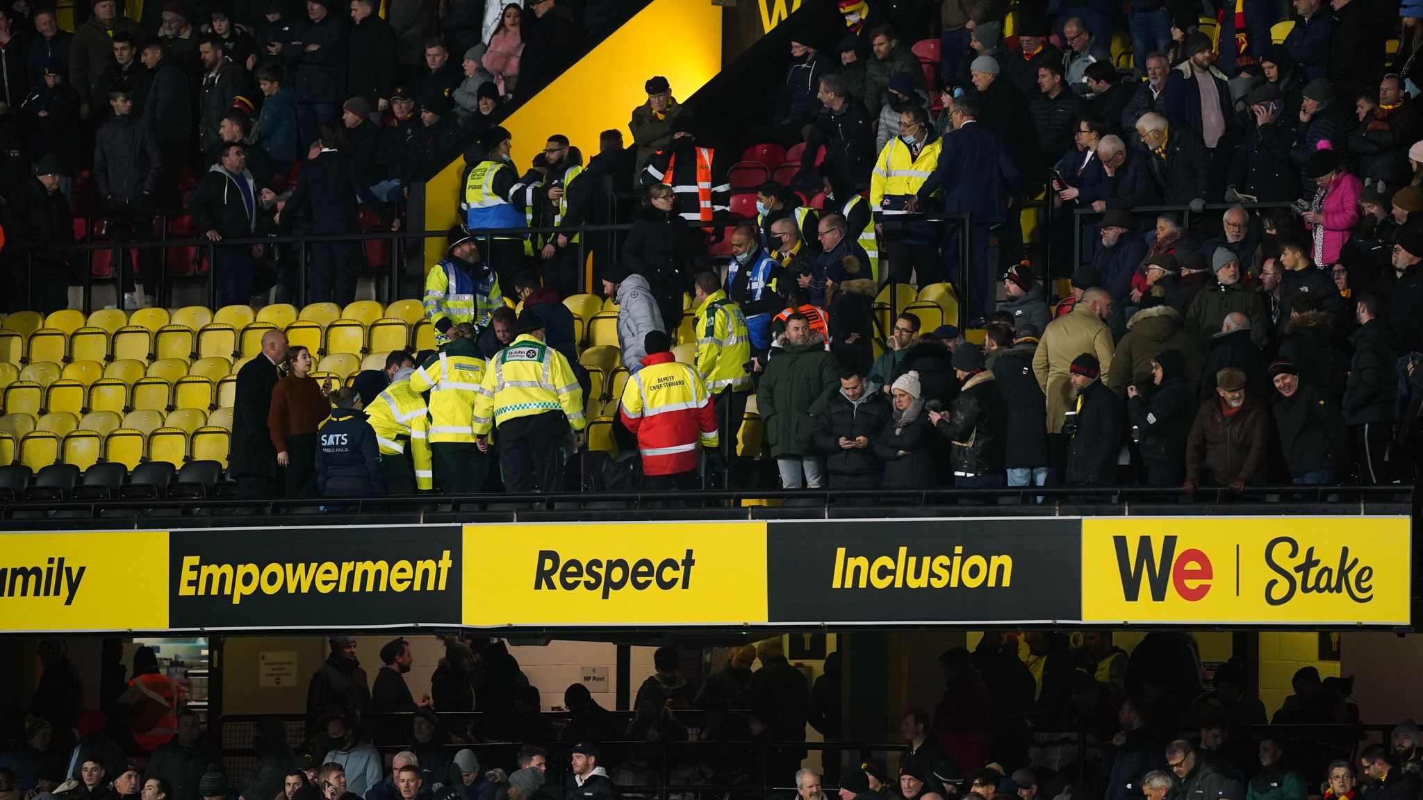وذكرت وسائل إعلام بريطانية أن الطاقم الطبي أجرى عملية إنعاش قلبي/رئوي للمشجع على جانب الملعب قبل توقف اللعب.