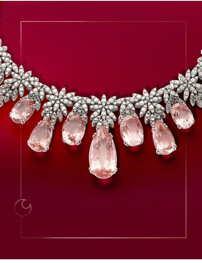 عقد أضاف توهج على أنوثة النجمة بماس أبيض ورمادي وحصوص المورجنيت الزهري.