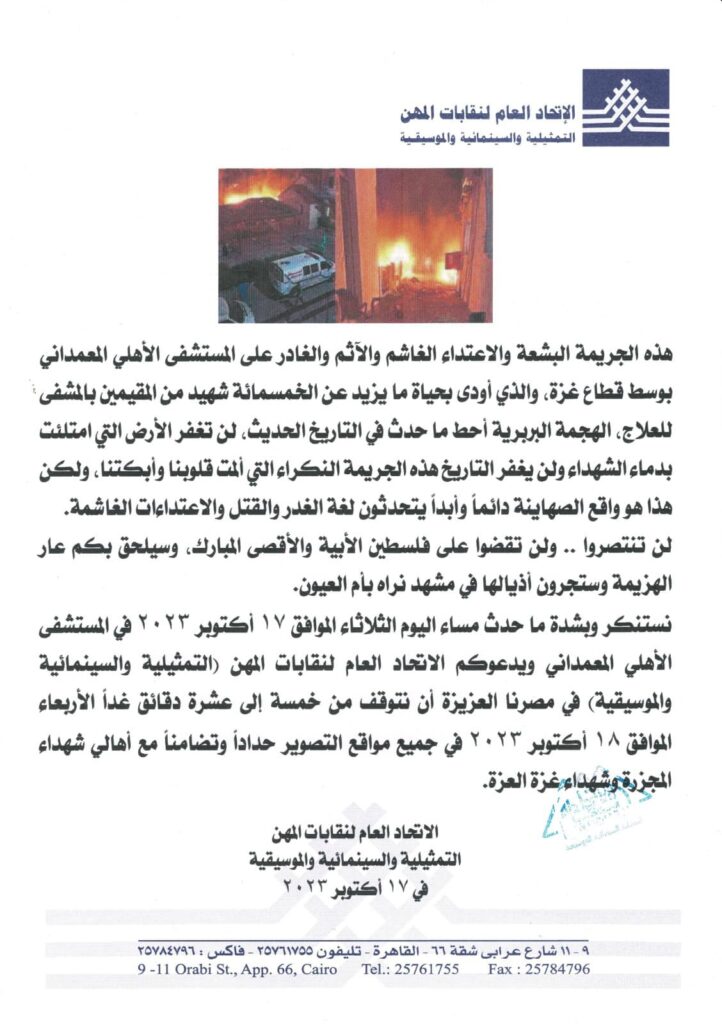 ونشر الاتحاد العام لنقابات المهن التمثيلية والسينمائية والموسيقية، بيان جاء به: يستنكر الاتحاد العام لنقابات (التمثيلية- السينمائية- الموسيقية) العدوان الآثم ضد شعب فلسطين ويدعوا إلى وقفة تضامنية مع أهلنا في غزة، وذلك يوم الثلاثاء 17-10-2023، الساعة الثامنة مساءً بنادي نقابة المهن التمثيلية- شارع البحر الأعظم – الجيزة.