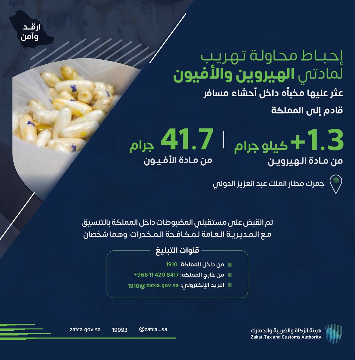 بالتنسيق مع المديرية العامة لمكافحة المخدرات في المملكة العربية السعودية، أحبطت “هيئة الزكاة والضريبة والجمارك” في “مطار الملك عبد العزيز الدولي” محاولة تهريب أكثر من 1.3 كيلوجراماً من مادة الهيروين، و41.7 جراماً من الأفيون عُثر عليها مُخبأة في أحشاء مسافر قدم إلى المملكة عبر “مطار الملكعبدالعزيز الدولي” بمدينة جدة.