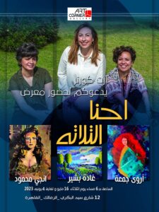 فى تمام السادسة والنصف من مساء الثلاثاء القادم 16 مايو تستقبل قاعة” آرت كورنر ” معرض ” احنا التلاتة ” للفنانات التشكيليات ( أروى جمعة ، إنچي محمود ، غادة بشير )