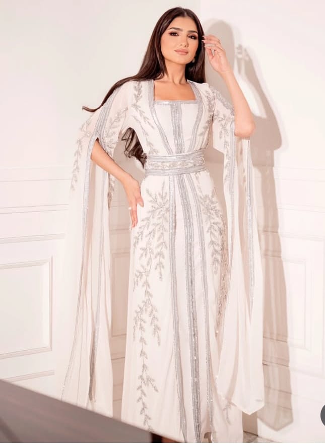 اما الفنانة مي عمر المشهود لها بأناقة رفيعة بدت مبهرة بعباءة بيضاء “كريمي اللون” النقاء فيها أسلوب ومعنى مع تطريزات ملفتة بشكل طولي من أوراق واغصان فضية براقة وخصر مزنر بحزام من فضة التطريز مظهر جليل ومفعم بالأنوثة والتدفق الجمالي. العباءة من مجموعة قفطان حنان الخلف الراقية.