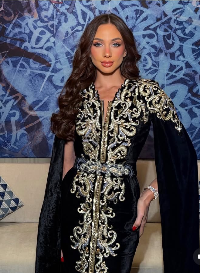 الفنانة داليا البحيري التي تهوى الإطلالات ذات المعاني. بدت بقفطان مصري الروح ينم عن تلك الحقبات الزمنية الراسخة ولاسيما بالرسوم والخطوط التي تعيدنا عصور إلى الخلف في قفطان أسود بقبة مطرزة بالذهبي وفوقه مشلح على شكل كاب طويل مطرز بالكامل بحروف مصرية قديمة.