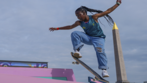 وتقام مسابقة التزلج اللوحي في ميدان الكونكورد، وسط باريس، بالقرب من المرجل الأولمبي الذي يتواجد في منطاد هوائي هذا العام والذي تم إيقاده مع نهاية الحفل الافتتاحي أمس الجمعة.