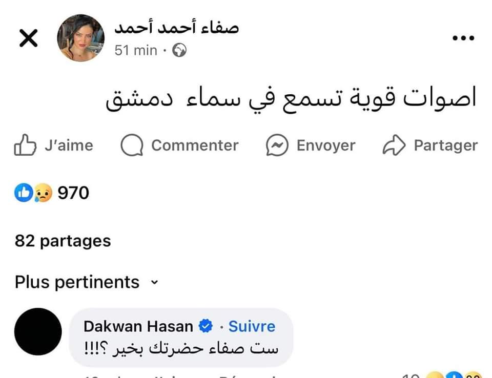 واخر ما كتبته المذيعة صفاء أحمد عبر صفحتها على الفايسبوك قبل لحظات من استشهادها كان: اصوات قوية تسمع في سماء دمشق.