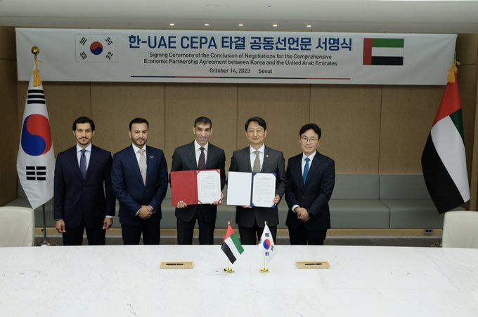 وقع معالي الدكتور ثاني بن أحمد الزيودي وزير دولة الإمارات العربية المتحدة للتجارة الخارجية، ومعالي دوكغون آهن وزير التجارة في جمهورية كوريا الجنوبية، بياناً مشتركاً في العاصمة سيؤول إعلاناً على إنجاز محادثات الشراكة الإماراتية الكورية تمهيداً لإبرام الاتفاقية رسمياً لاحقاً. واعتبر الزيودي من خلال تدوينة لمعاليه على حسابه الرسمي “إكس” الخطوة بمحطة جديدة مهمة في جهود الإمارات لتوسيع شبكة شركائها التجاريين عبر برنامج اتفاقيات الشراكة الاقتصادية الشاملة.