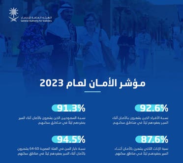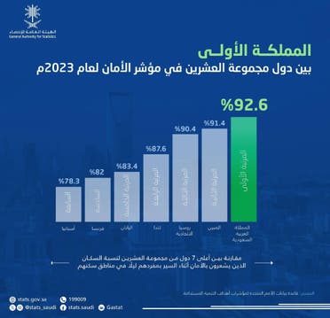 يذكر أن المملكة هي الأولى ضمن مجموعة العشرين في ارتفاع نسبة مؤشر الأمان في تقرير التنمية المستدامة 2020م، وتُعد نشرة مؤشر الأمان في الحي إحدى مخرجات المسح الاقتصادي الاجتماعي الأسري الذي نُفذ خلال عام 2023م، ويضم المسح عددًا من المؤشرات التي تخدم المجالات الاقتصادية والاجتماعية والأسرية في المملكة، ويُعنى بحساب نسبة السكان الذين يشعرون بالأمان أثناء السير بمفردهم في مناطق سكنهم.الرئيسية