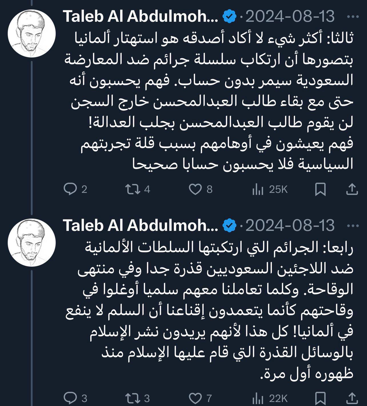 كشفت تقارير صجفية أنّ السلطات السعودية أرسلت العام الماضي أربع مذكّرات للسلطات الالمانية تُحذّرها فيها من المواطن السعودي طالب عبدالمحسن الذي نفّذ الهجوم في السوق الميلادي في ماغدبورغ يُمثّل تهديداً نظراً لتغريداته.