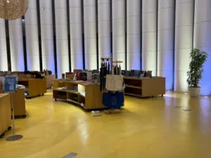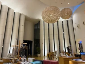 ويقع الفناء الأول في الحي الدبلوماسي بالرياض، في مبنى تاريخي قديم يعود إلى البنك “الأول” المعروف سابقاً باسم البنك السعودي الهولندي، أول بنك تجاري يعمل في السعودية حينها، وتحتفظ ذاكرة المكان ذاتها بقصص لافتة كون المكان يتبع للبنك الوحيد في السعودية وقتئذ، إذ احتفظ المبنى ذاته الذي بات اليوم مساحة إلهام باحتياطيات البلاد من الذهب، فيما تلقى عائدات النفط نيابة عن الحكومة.