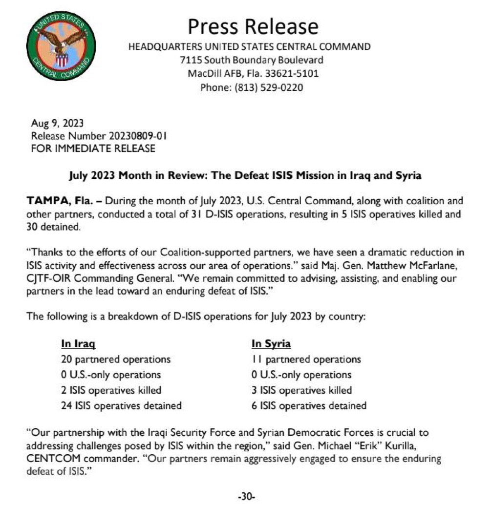 خلال يوليو 2023، نفذتالقيادة المركزية الأمريكية – CENTCOM” إلى جانب التحالف وشركاء آخرين ، ما مجموعه 31 عملية ضد تنظيم الدولة الإسلامية “داعش، أسفر عنها مقتل 5 عناصر من تنظيم الدولة الإسلامية واعتقال 30 عنصراً منهم. هذا ما أكده بيان رسمي صادر عن “القيادة المركزية الأمريكية، والذي حصلتنُص خبرعلى نسخةٍ منه.
