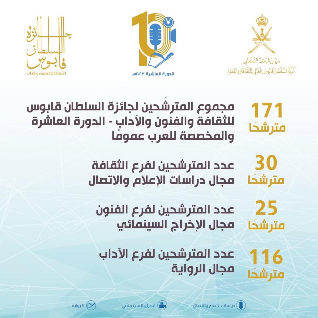 وعن فرع الآداب- مجال الرواية، فاز الروائي الجزائريّ واسيني الأعرج بـ جائزة السلطان قابوس للثقافة والفنون والآداب في نسختها العاشرة التقديريّة والمخصصة للعرب. بينما حُجِبت جائزة السلطان قابوس للثقافة والفنون والآداب في نسختها العاشرة التقديريّة والمخصصة للعرب في فرع الفنون، مجال الإخراج السينمائي.
